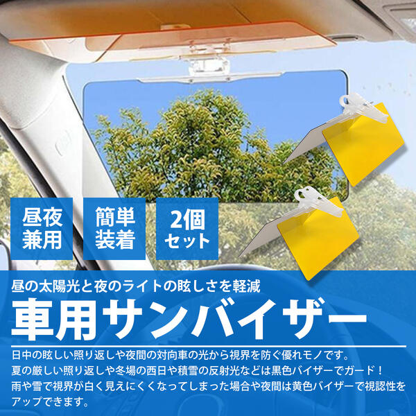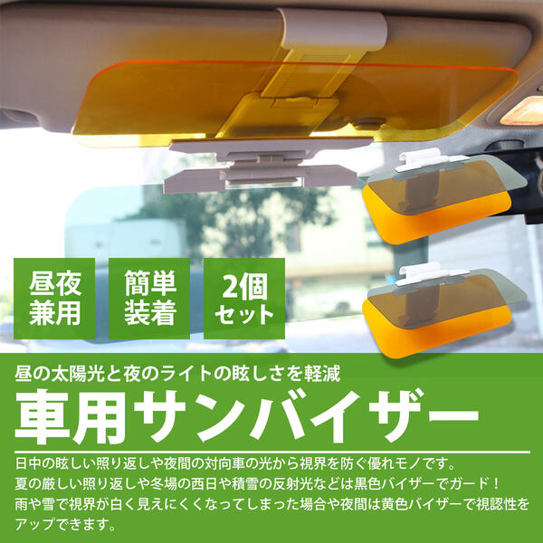 サンバイザー 2個セット 車 車用 カーサンバイザー カーバイザー 昼夜兼用 サングラス不要 遮光 日よけ 日除け UVカット 黒 UV フロント フロントガラス クリップ式 2in1 2way デイ&ナイト スモーク イエロー 送料無料 CARSVBSET2