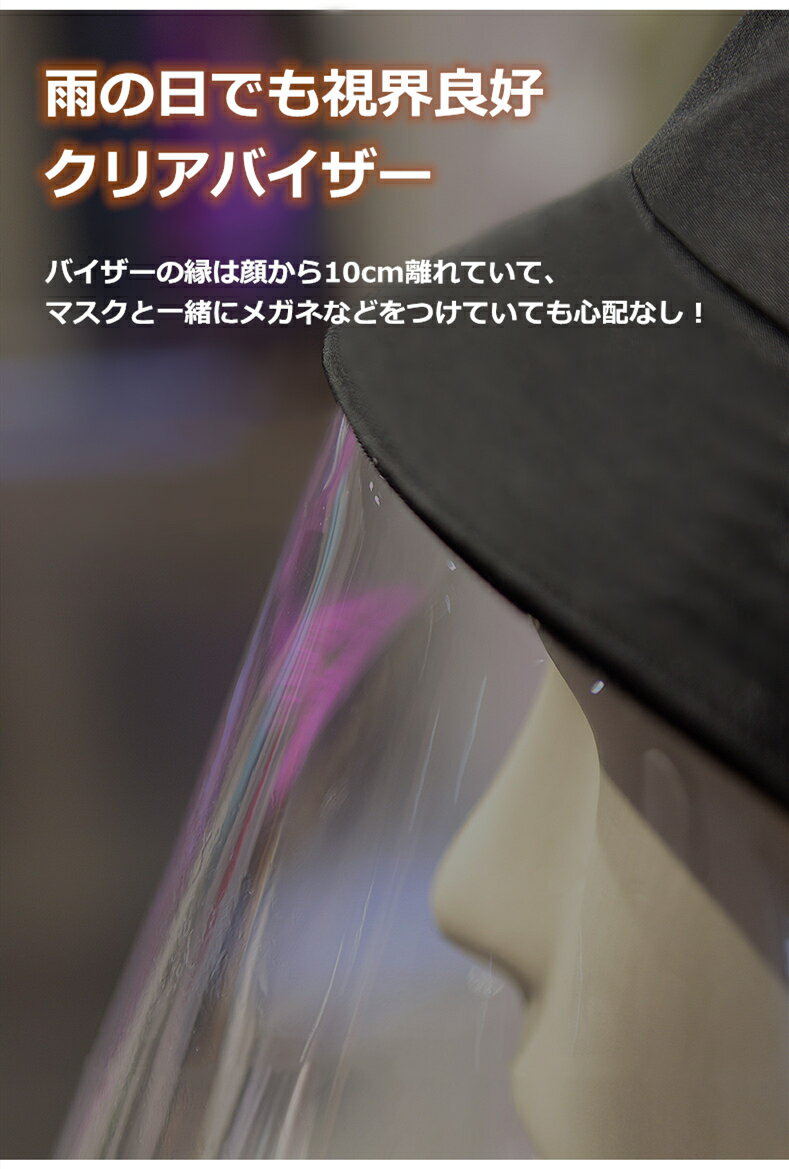 雨の日でも視界良好の透明バイザーなので、顔面をしっかりガードながらはっかり見える! また、バイザーの縁は顔から10cm遠く離れており、化粧崩れも防ぎ、マスクと一緒にメガネなどをつけていても心配がありません。